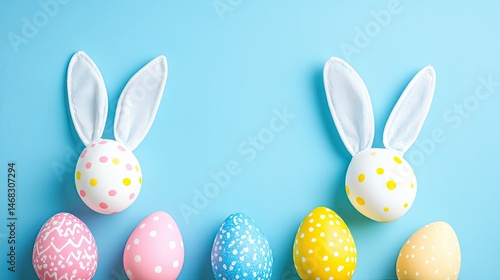 © Salisa, Obraz premium Easter eggs with bunny ears on a light blue background.