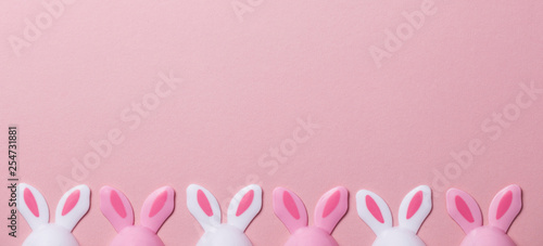 Fototapeta premium Easter eggs with bunny ears on a pastel pink background