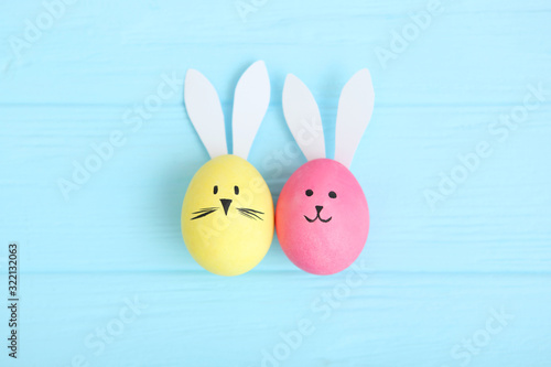 © White bear studio , Obraz premium Easter eggs with cute faces and ears on a colored background.