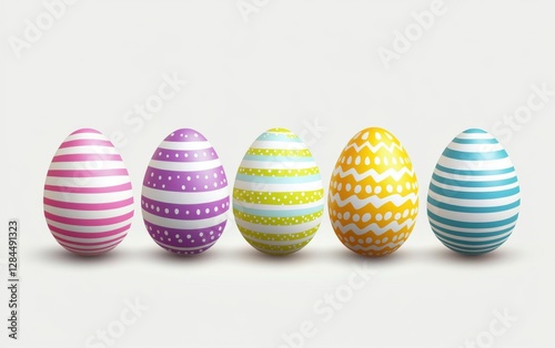 Obraz premium 5 Easter eggs with different patterns, arranged in a row on a white background
