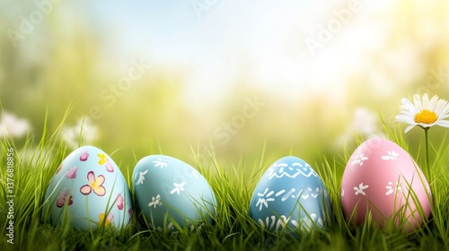 Fototapeta premium Easter eggs with floral patterns in green spring meadow