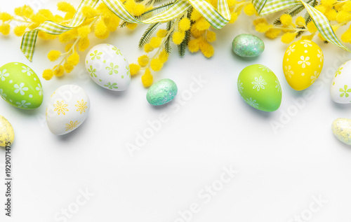 Fototapeta premium Easter eggs with mimosa flowers and ribbon border
