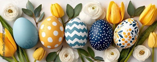 Fototapeta premium Easter eggs with yellow, blue and white patterns surrounded by tulips and ranunculus