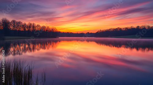 © Thawatchai, Fototapeta premium Easter family decoration event at serene lake nature landscape colorful sunset reflection viewpoint