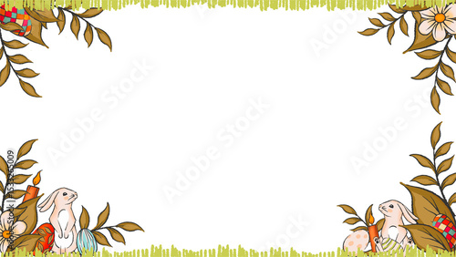 © vectorfusionart, Fototapeta premium Easter flat frame is showing bunny duo, eggs and carrots on transparent background, copy space
