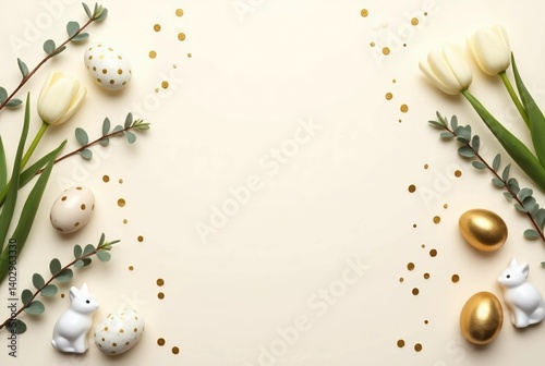 © Amith, Fototapeta premium Easter Flat Lay with Eggs, White Tulips & Greenery on Light Background