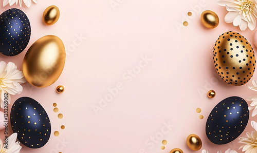 Fototapeta premium Easter flat lay with gold and navy eggs, elegant dotted accents, on pastel...