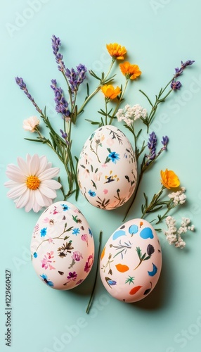 © Ilja, Fototapeta premium Easter floral pattern eggs, springtime blooming flowers on a blue background. Happy Easter concept.