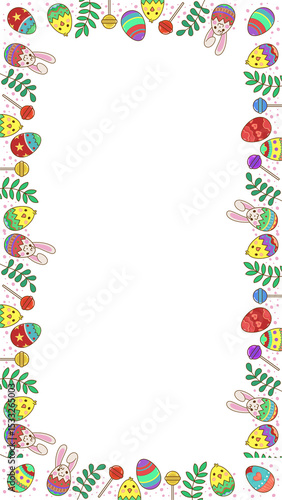 Fototapeta premium Easter frame is appearing in flat design with patterned bunny eggs, chicks, transparent background
