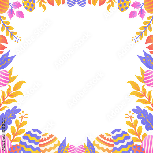 © vectorfusionart, Fototapeta premium Easter frame is showing decorated eggs, leaves in flat style on transparent background, copy space