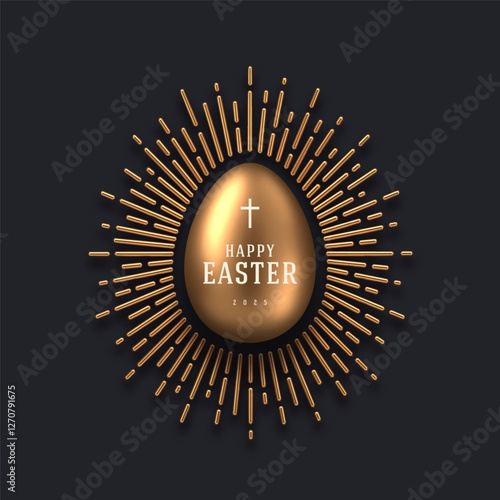 © sergo77, Fototapeta premium Easter greeting card design. 3d golden egg with type design and sunburst. Vector illustration.
