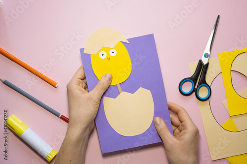© Parten, Fototapeta premium Easter greeting card in egg shape. How to make children's paper craft. Step 9. Simple creative art project. Step by step instructions. Homemade easy paper applications. DIY concept.