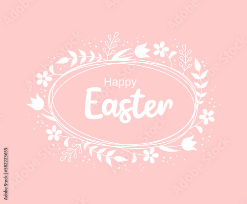© Alrika , Naklejka premium Easter greeting card. White frame of flowers and leaves with typography inside on a pastel pink background. Flat vector illustration