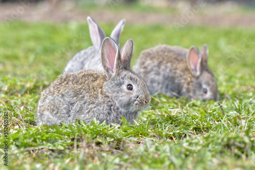 Fototapeta premium Easter greetings - Easter bunny rabbit sitting in green grass.