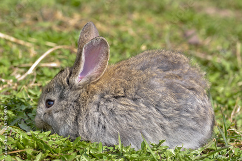 Fototapeta premium Easter greetings - Easter bunny rabbit sitting in green grass.