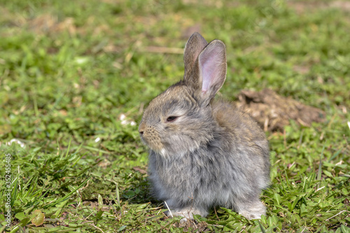 Fototapeta premium Easter greetings - Easter bunny rabbit sitting in green grass.