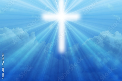 Fototapeta premium Easter illustration with a shining cross on blue sky with white clouds and lightbeam.