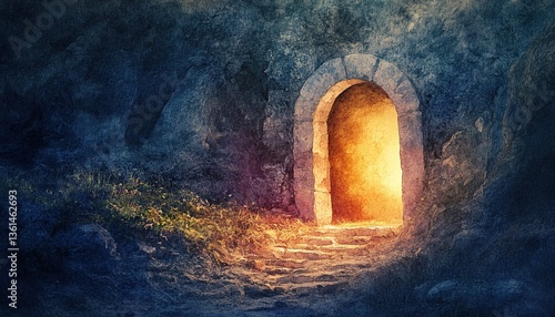 © wang, Fototapeta premium Easter Morning: The sealed tomb at dawn, light softly breaking through darkness. Digital watercolor painting.