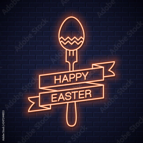 © Pushkarevskyy, Obraz premium Easter neon menu. Happy Easter neon fork