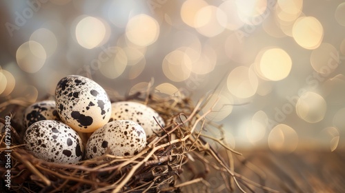 Obraz premium Easter nest featuring quail eggs with soft bokeh background for copy space