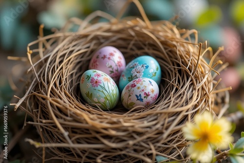© Hisan, Obraz premium Easter Nest with Decorated Eggs and Spring Flowers - Holiday Season Imagery
