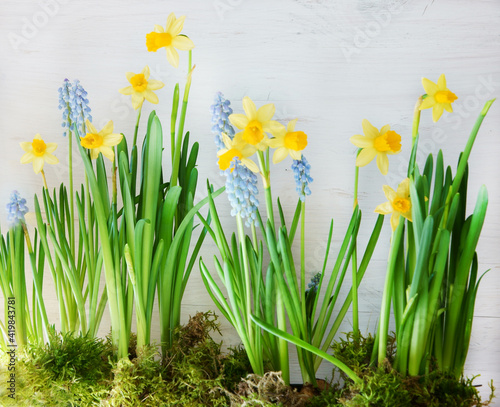 Fototapeta premium Easter or spring background with daffodils, quadrat