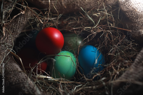 © alexkich, Obraz premium Easter painted eggs on burlap
