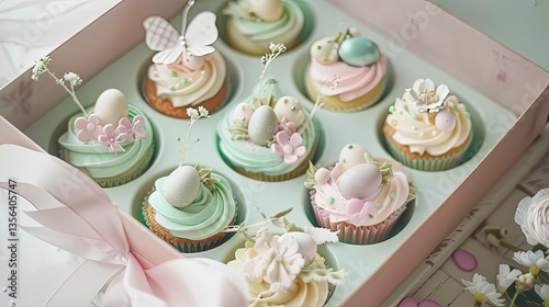 © SpringSull, Fototapeta premium Easter Pastel Cupcake Box with Floral and Egg Decorations