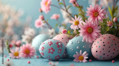 © Emile, Obraz premium easter poster,with dyed easter eggs spring flowers bunny on pastel blue background.stock photo