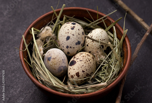 Obraz premium Easter quail eggs in the hay in a clay bowl close-up