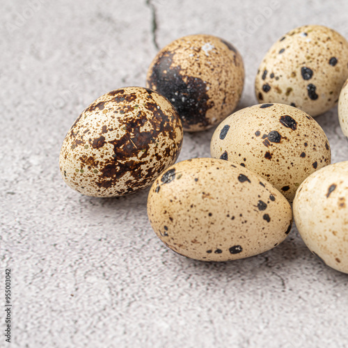 Obraz premium Easter quail eggs. Spring background with small easter quail eggs. Vintage...