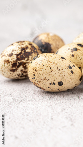 Obraz premium Easter quail eggs. Spring background with small easter quail eggs. Vintage...