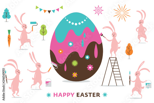 Fototapeta premium Easter scene, cute bunnies paint a big Easter Egg