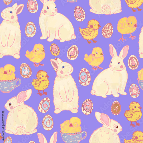Obraz premium Easter seamless seasonal spring pattern. White rabbits, yellow chickens, painted eggs with ornaments on a violet background