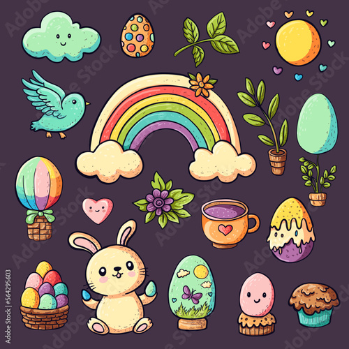 Naklejka premium Easter set - cute cartoon bunny, rainbow,eggs, flowers, sun, character...
