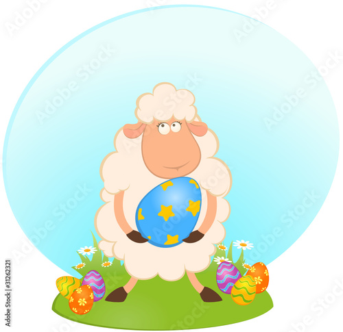 © Forewer, Fototapeta premium Easter sheep with colored egg. Easter card