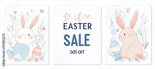 Fototapeta premium Easter Social Media Template Set - 3 Ready-to-Use Pastel Designs with '50% OFF' Sale Banner, Bunny Silhouette & Geometric Elements (Vector, AI Generated)