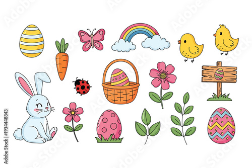 Fototapeta premium Easter Spring Clipart Set. Cute Bunny, Rainbow, Chick, and Colorful Floral Garden Vector Icons