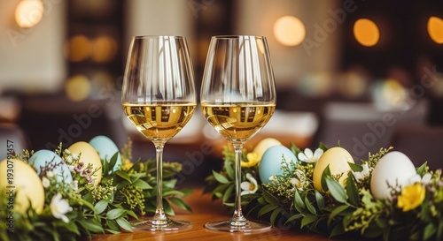 © Creative Farid, Naklejka premium Easter sunday celebration with champagne glasses and decorative tulips