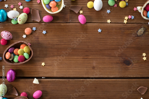 © Syda Productions, Obraz premium easter, sweets and confectionery concept - chocolate eggs and candy drops on wooden background
