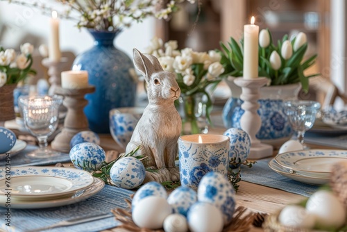 Fototapeta premium Easter Table Decorated, Colorful Eggs and Easter Bunny Celebration Design
