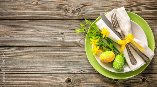 © Alexander Raths, Fototapeta premium Easter table setting with daffodil and cutlery