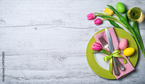 Naklejka premium Easter table setting with spring flowers and cutlery