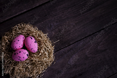 © Aerial Mike, Obraz premium Easter theme. handmade Egg bokeh background, place for typography, Happy Easter