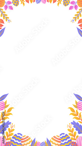 Fototapeta premium Easter-themed frame is featuring pastel eggs and foliage in flat design on...