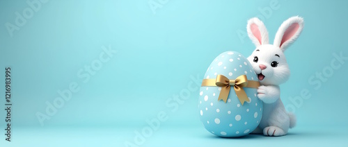 © DALITALI , Obraz premium Easter white bunny with easter blue polka dot egg on blue background