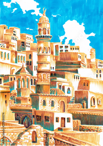 Obraz premium Eastern architecture. Houses and mosques on a sunny slope. Stylized sketch markers.