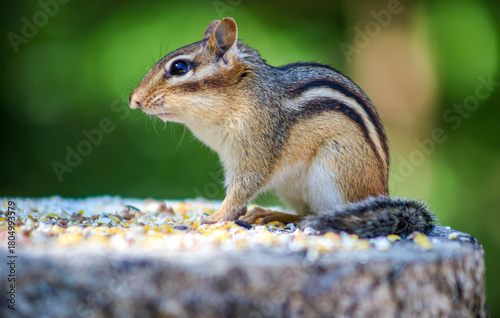 © Claudia, Fototapeta premium Eastern Chipmunk on Tree Stump Eating Seeds