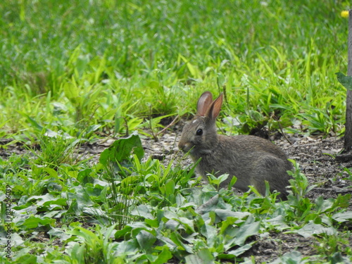 Fototapeta premium Eastern cottontail rabbit foraging the wetland vegetation for food. Wildwood...
