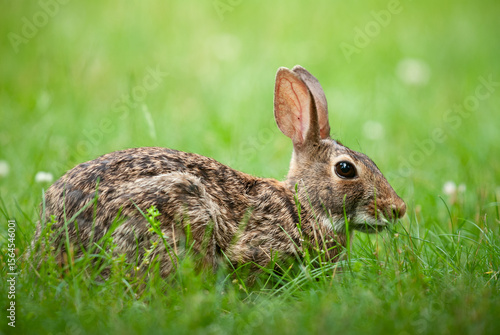 © Cavan, Fototapeta premium Eastern cottontail rabbit grazing on grass in a backyard lawn
